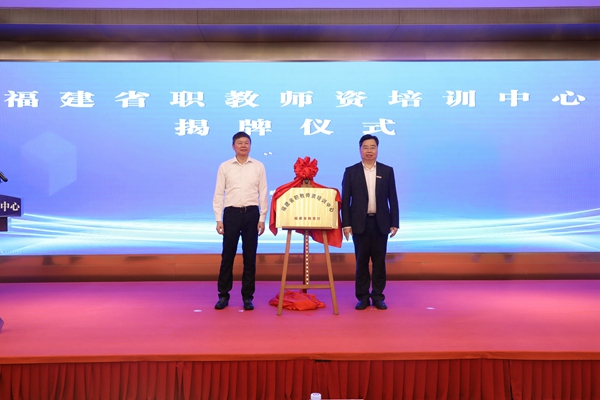 省教育厅一级巡视员陈明庆和校长廖深基共同为福建省职教师资培训中心揭牌