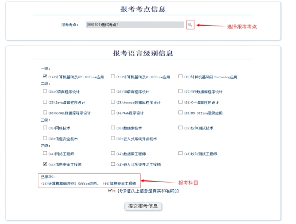 选择完科目后,科目列表下方会显示已报考的科目。考生确认基本信息和报考科目无误后,勾选“我保证以上信息是真实和准确的”,点击“提交报考信息”按钮,进入下一步。